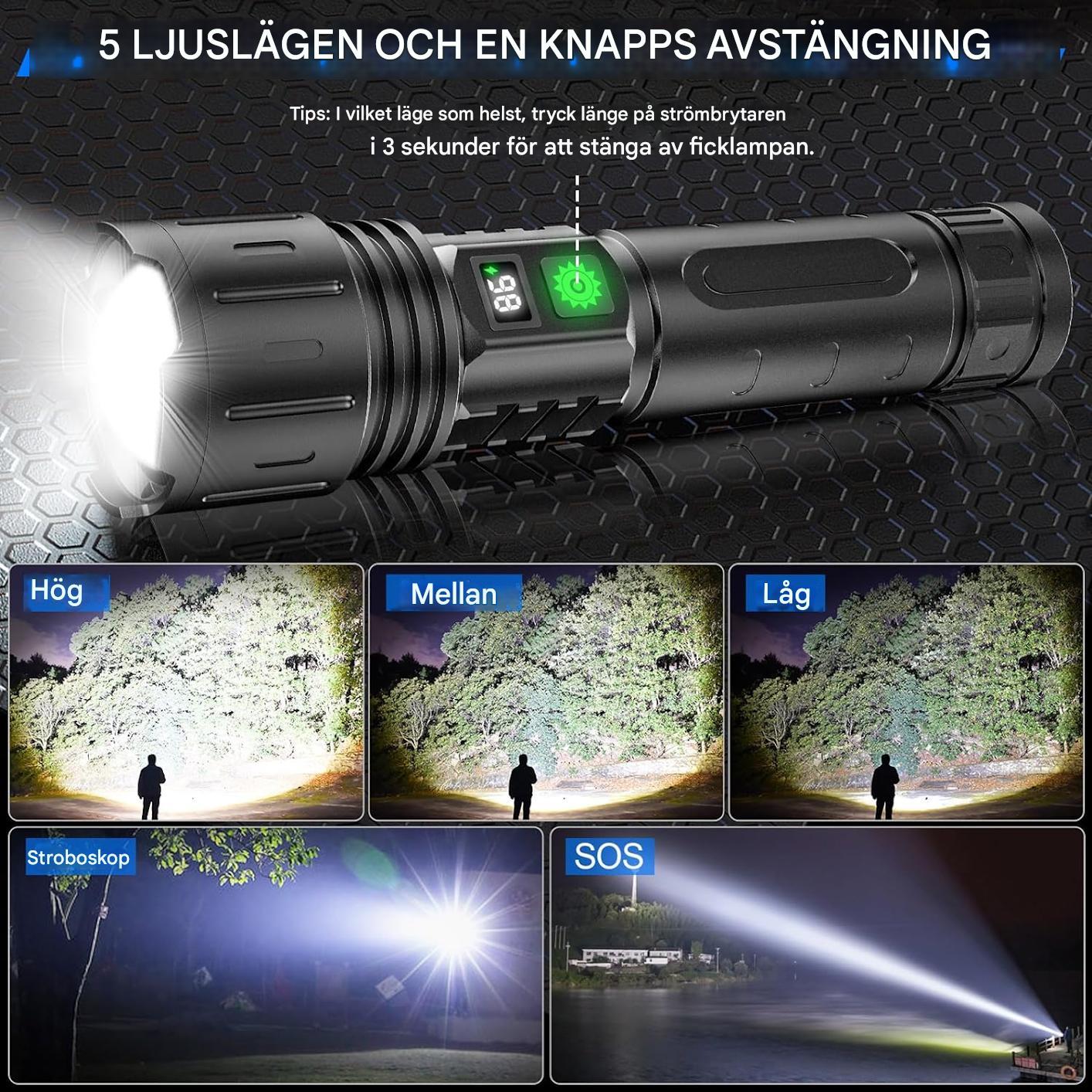 Denna ficklampa på 100 000 lumen är idealisk för friluftsentusiaster, nödsituationer eller professionella uppgifter som kräver maximal sikt. Med extrem ljusstyrka, hållbar konstruktion och flera ljuslägen säkerställer den att du alltid är förberedd för alla situationer.