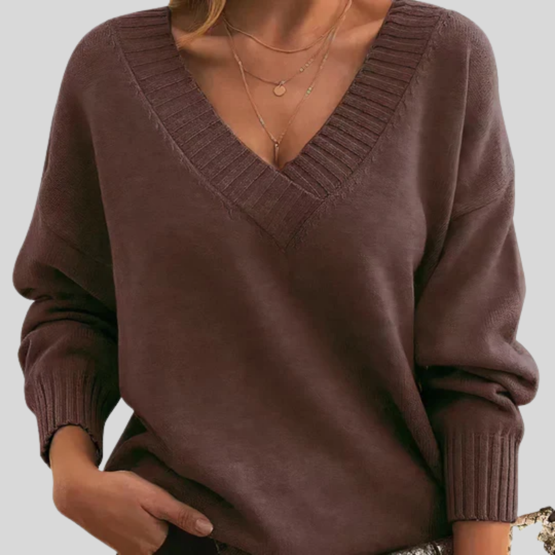 Denna stickade tröja för kvinnor har en klassisk V-ringad design som kompletterar alla outfits. Tillverkad av ett mjukt blandat tyg, ger den en elegant look som passar för arbete, resor eller vardagliga tillfällen. Dess enkla silhuett och ribbade detaljer gör den till ett oumbärligt plagg i alla garderober.