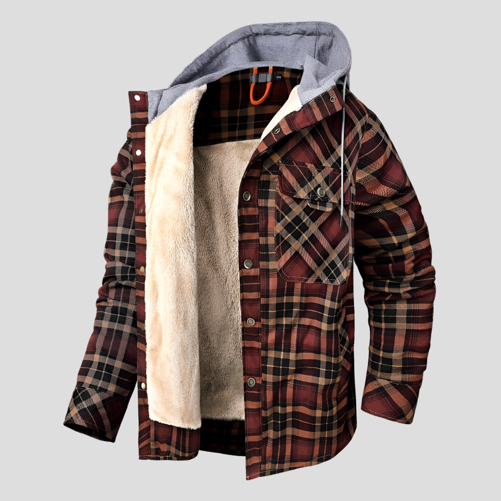 Omfavn den perfekte kombinasjonen av varme og stil med denne rutete skjortejakken med hette, ditt opplagte valg for komfort og robust utseende.