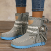 Boho Western Boots er et stilig og komfortabelt tilskudd til skosamlingen din. Disse ankelstøvlene er laget av mykt børstet stoff, har lekefullt strikkede frynser og en robust gummisåle, noe som gjør dem perfekte for hverdagsbruk. Enten du skal på jobb, gjøre ærender eller nyte en avslappet dag ute, tilbyr disse støvlene både mote og funksjon.