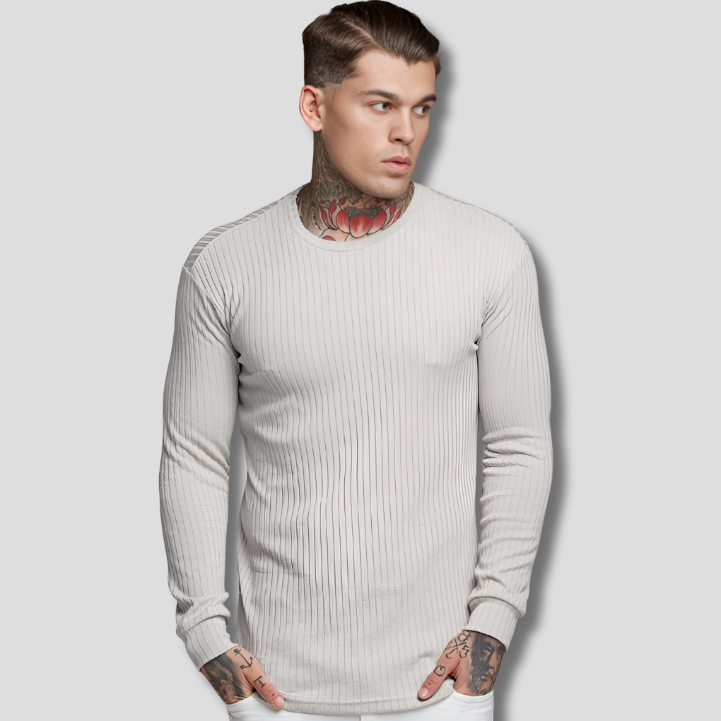 ✔ Rund hals med ribbestrikket krage